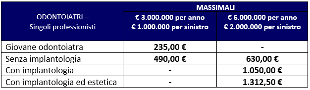 - Franchigia assoluta: € 500,00 (senza implantologia), € 2.500,00 (con implantologia)
